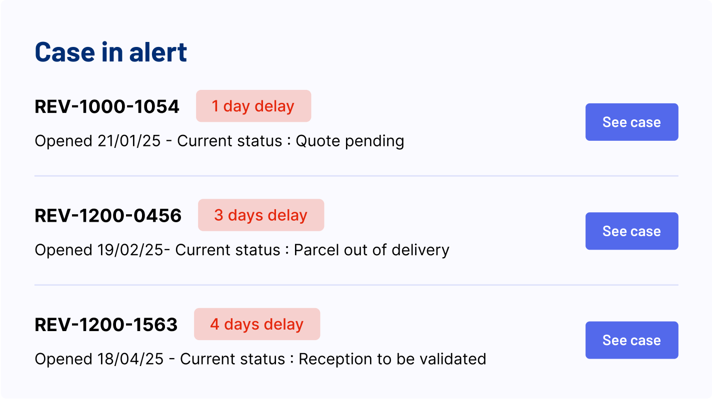 Lack of visibility makes it hard to manage priorities. Revers.io provides a clear overview of every open case, upcoming action, and operational friction point. Managers and agents can monitor progress in real time and reallocate resources proactively.