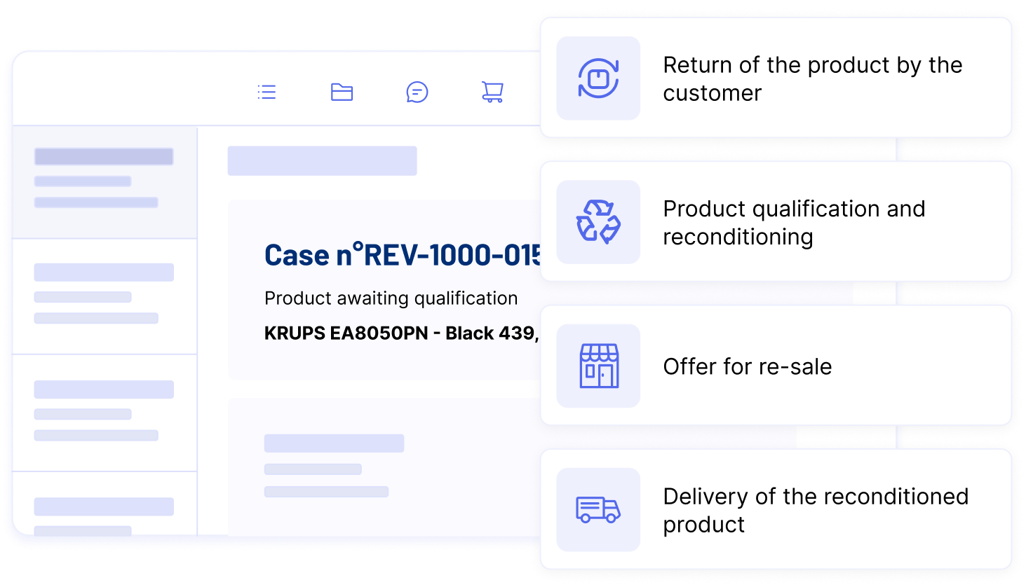 Every return is an opportunity for reuse. Using warehouse-collected data (condition, accessories, photos, customer comments…), Revers.io’s second life module identifies items eligible for repair, refurbishment, or resale. Products are routed in one click to the right path. This approach increases residual value while reducing waste.