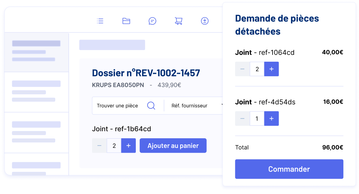 Le module Revers.io permet de commander directement les pièces détachées manquante, et d’automatiser ce processus, afin de permettre un réapprovisionnement rapide et sans erreur. En réduisant les interventions manuelles, l'automatisation des commandes optimise vos coûts d'approvisionnement et améliore la réactivité des réparations.