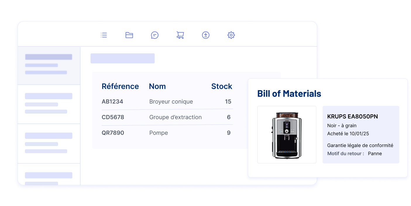Revers.io centralise et simplifie la gestion de votre catalogue de pièces détachées, en vous offrant une vue claire et intuitive des Bill Of Materials (BOM). Grâce à la connaissance précise des liens entre les pièces et les produits, vous évitez les doublons et optimisez vos commandes en accédant rapidement aux pièces nécessaires pour chaque intervention. Cela vous permet une gestion plus efficace et un gain de temps dans la préparation des réparations.