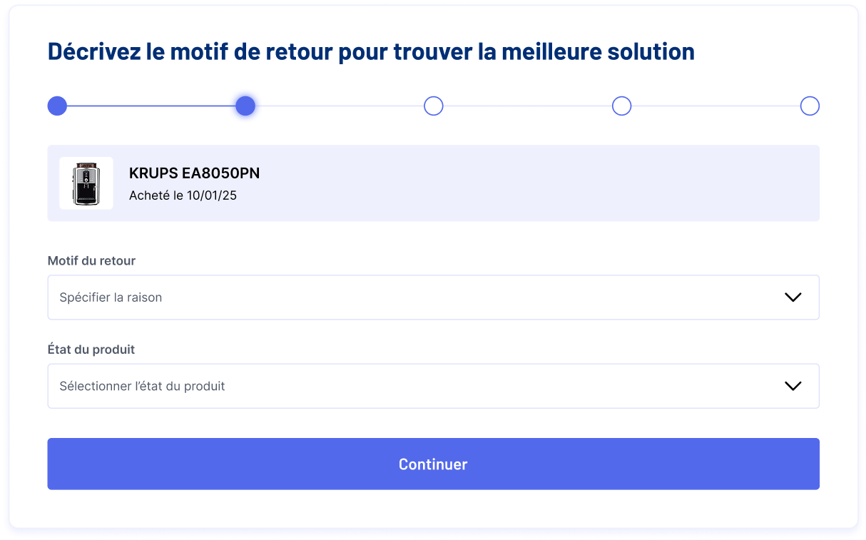 Avec un accès 24/7 à un portail intuitif brandé à vos couleurs, vos clients peuvent initier une demande de retour ou de réparation, suivre l’avancement de leur dossier en temps réel et recevoir des mises à jour automatiques. Plus besoin de contacter le service client : ils trouvent rapidement des solutions adaptées, ce qui réduit leur frustration et améliore leur expérience globale.