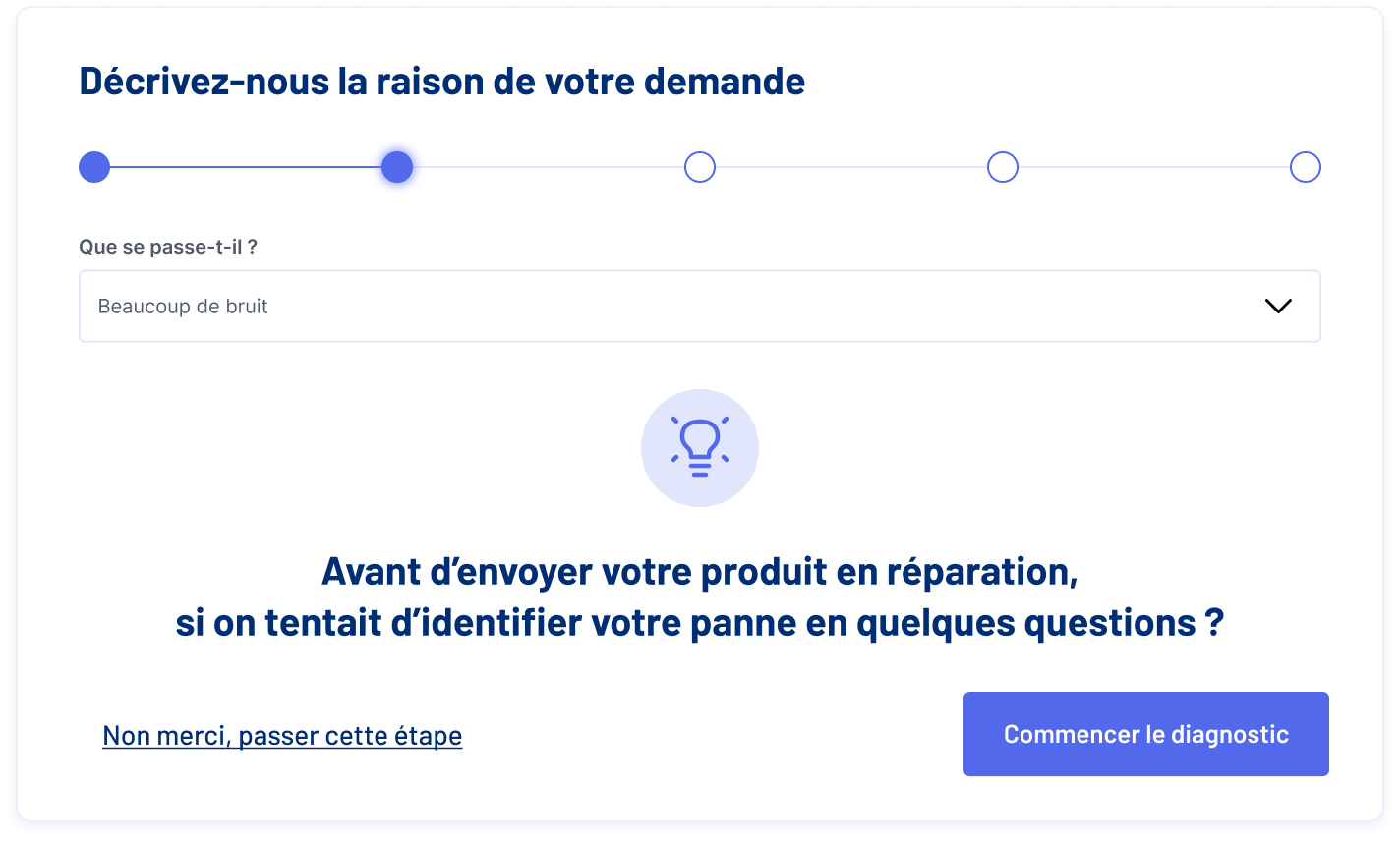 Avec notre moteur d’autodiagnostic basé sur l’IA, vos clients détectent rapidement la cause de leur problème, directement depuis leur portail. Guidés étape par étape, ils accèdent à une solution adaptée sans délai, pour une expérience plus fluide et un traitement accéléré de leurs demandes.